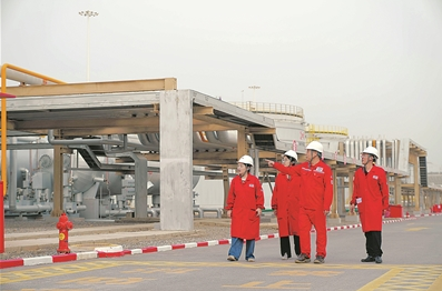 温宿县政协委员李雪松(右二)向报道组介绍油气开采情况
