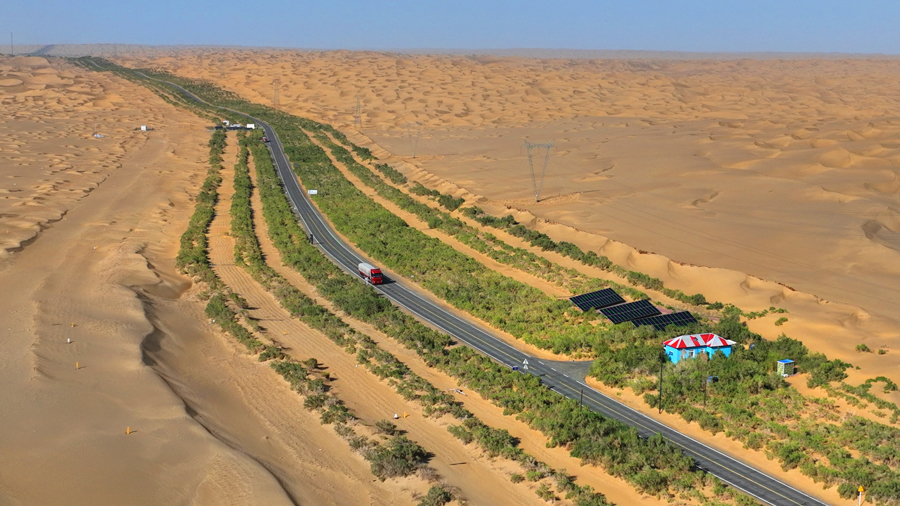 2022年,中国石油建成我国首条零碳沙漠公路——塔里木沙漠公路。这里曾狂风怒号、人迹罕至,如今,由沙拐枣、梭梭、红柳等组成的防护林带郁郁葱葱。