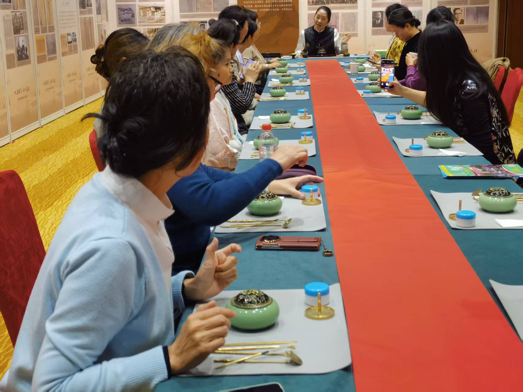 “光看不够,得亲手试试才过瘾!”“国风体验,浸润人心”环节里,七大体验区挤满了台胞。青年台胞围在青花瓷画diy桌前,用瓷片拼凑着不同的形状,不时向非遗老师请教“如何让线条更流畅”;女台胞们围坐在茶席旁,听茶艺师讲解冲泡手法,轻嗅茶香、细品茶味,还交流着“家乡阿嬷泡茶的习惯”;台胞家庭专区里,孩子们在父母指导下粘贴螺钿碎片,稚嫩的小手虽不熟练,却格外认真;老台胞们则跟着老师拨弄古琴琴弦,或是随着口令练起八段锦,动作舒缓,神情专注。