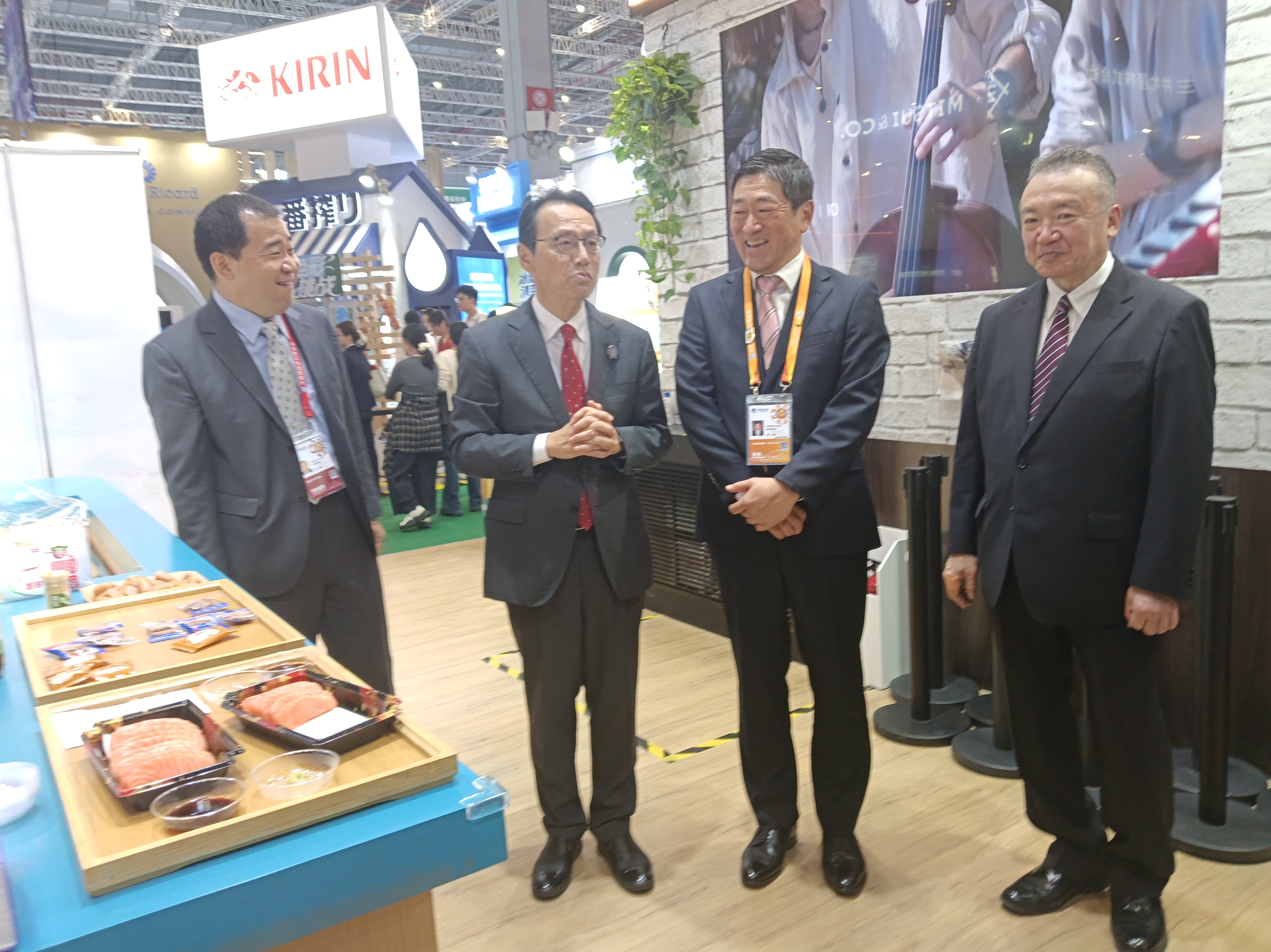 第八届进博会上,日本驻华大使金山宪治一行人在三菱商事展厅品尝饼干。(文/图 记者 肖楠)