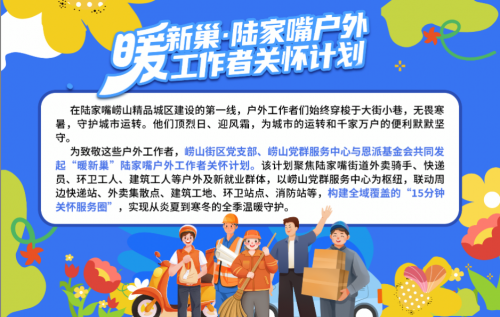 以空间矩阵打造暖新巢:以陆家嘴崂山党群服务中心为核心枢纽,以崂山党群服务中心为枢纽,联动周边快递站、外卖集散点、建筑工地、环卫站点、消防站等,构建陆家嘴全域覆盖的“15分钟关怀服务圈”,实现从炎夏到寒冬的全季温暖守护。