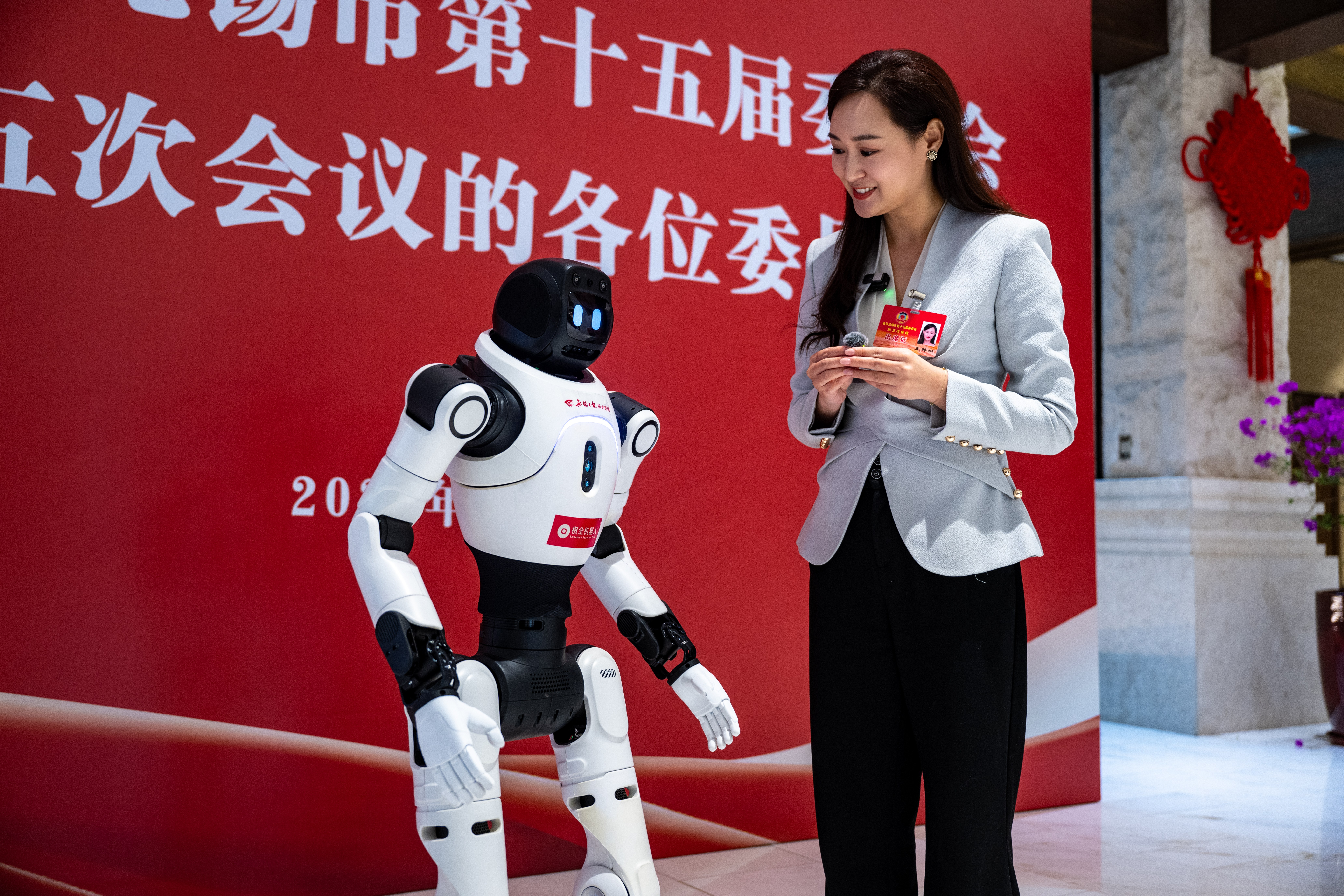 在今年的江苏省无锡市政协十五届五次全会上,人形机器人记者“晓锡”首次上线履职。这位硅基“记者”将全程扎根在会场内外围绕产业升级、民生保障城市建设、科技创新等热点议题开展现场采访、热点解读、互动问答等多重任务。近年来,无锡市集中力量、系统推进“人工智能+”标杆城市建设,重点打造具身智能机器人、智能终端、脑机接口6条产业链。2025年,全市人工智能规上核心产业营收预计达530亿元、增长11.3%;到2030年,全市人工智能产业规模占全省比重将达12%。(文/胡蕙 江迪 图/宗晓东)