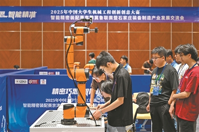 图为2025年中国大学生机械工程创新创意大赛智能精密装配赛京津冀鲁联赛期间,参赛选手调试设备。新华社发