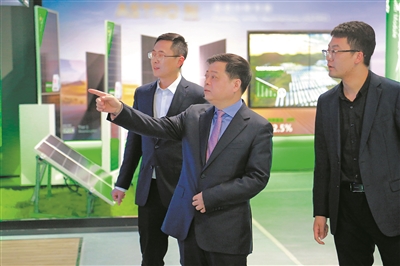 南存辉(中)就电力能源产业发展与工作人员交流。