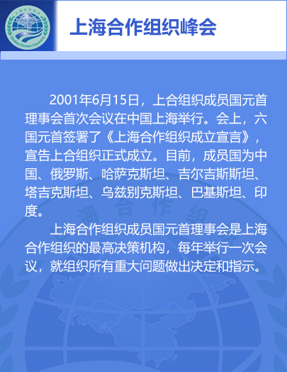 2001年6月15日,上合组织成员国元首理事会首次会议在中国上海举行?;嵘希浊┦鹆恕渡虾:献髯橹闪⑿浴?,宣告上合组织正式成立。